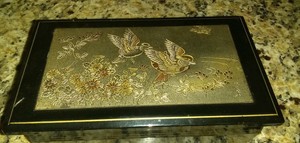 Japanese vintage jewelry & music box hand painted black lacquered inlay antique.